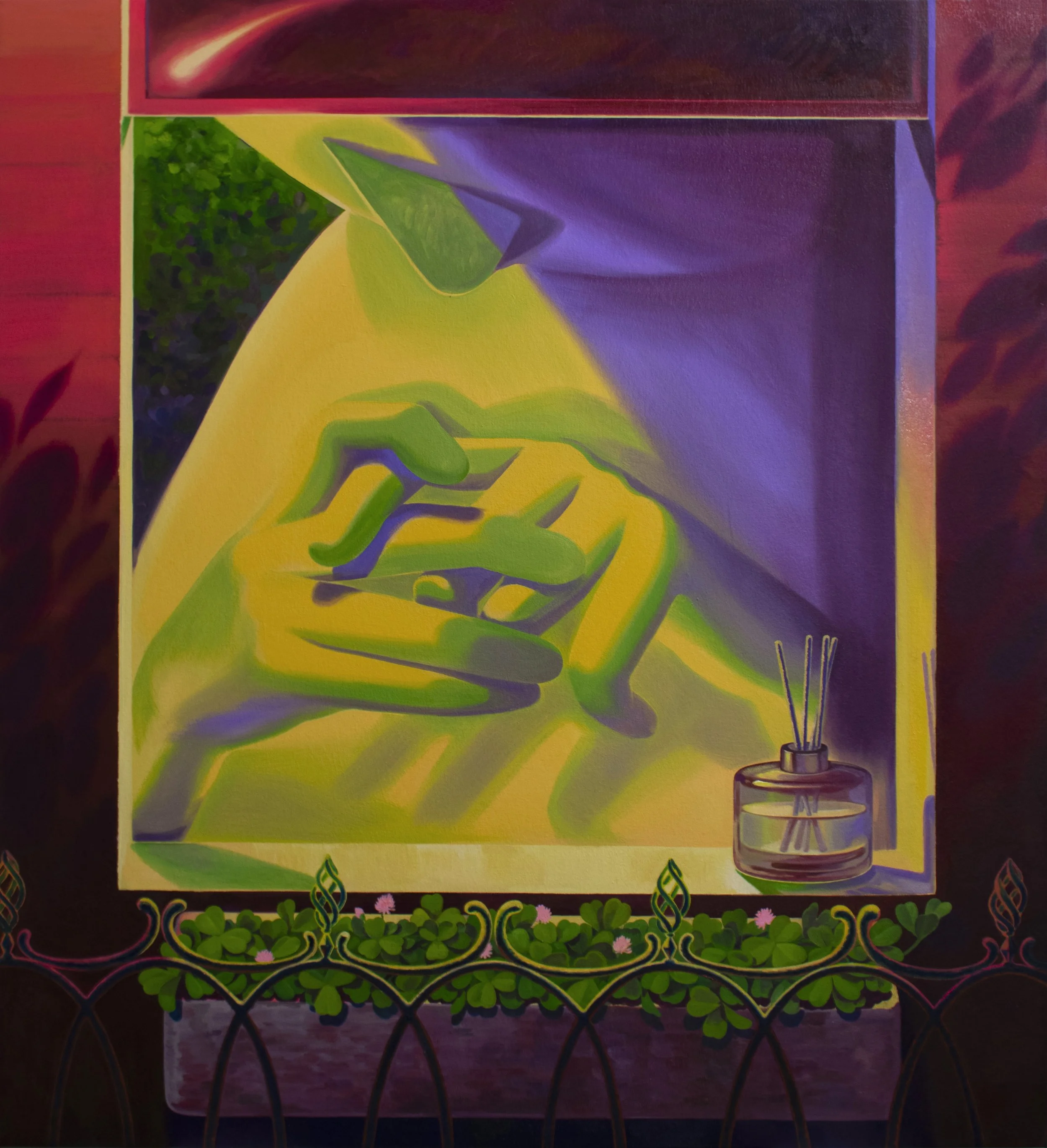 Summer ‘25 highlights work from emerging artists Heejo Kim and Amelie Wang, who each explore the use of color, the figure and symbolism to weave layers of personal history. Kim’s dreamy figurative paintings feel like fragments of a memory, each lived through curvy, vibrantly molten bodies found in moments of domesticity and candor. Light illuminates, confronts, and sometimes hides portion of narrative -- an expression that reveals much about the artist’s experience as a young woman in Seoul and her desire to find comfort and identity in space. Amelie Wang communicates a tumultuous relationship with China’s deeply censored history; attempting to understand how the social structures in her home country have impacted her daily life as an individual and her family as a unit. These paintings provide the artist with a sense of grounding embedded in their swirling compositions.